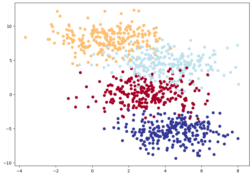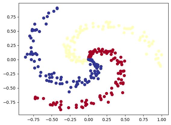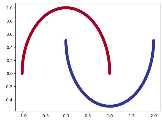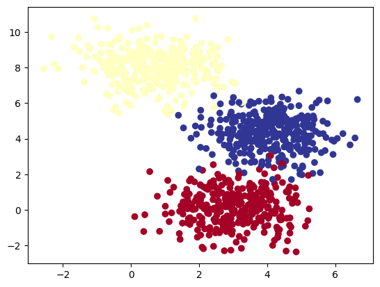 plt.scatter(x=X[:,0], y=X[:,1], c=y, cmap=plt.cm.RdYlBu)Output: