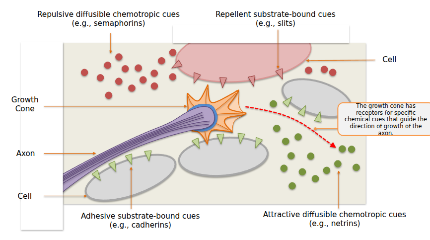 - The repulsive diffusible chemotropic cues and attractive diffusible chemotropic cues can exist to help guide. So are cell receptors.