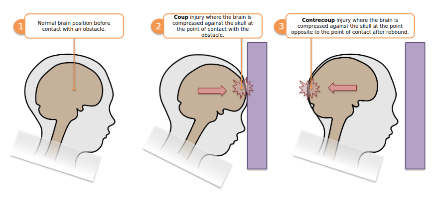 - Hematoma which is a blood mass in the coup or contrecoup