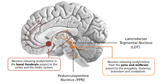 - Neurons release acetylcholine from the pons and midbrain