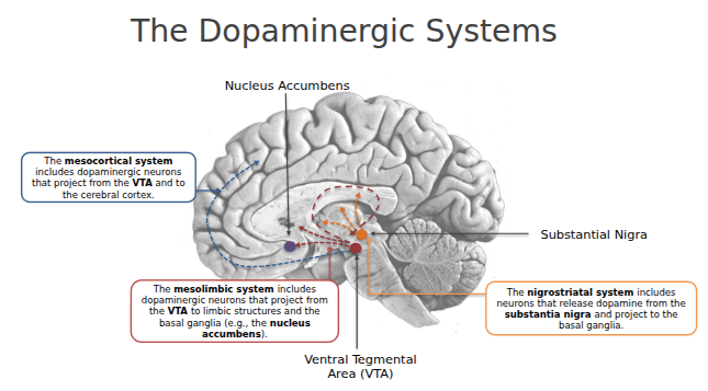 Shows the dopamine pathways in the brain. Dopamine is critical for reward, motivation, movement control, and emotional regulation.