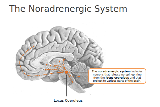 Shows the pathways for norepinephrine in the brain. Mainly neurons release norepinephrine from the Locus Coeruleus to various other parts of the brain.