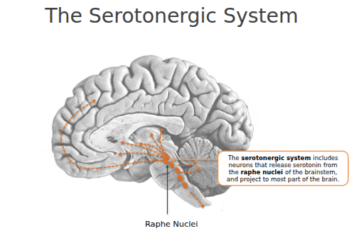 Shows the pathways for serotonin . Serotonin comes from the raph nuclei in the brainstem and projects to most parts of the brain.