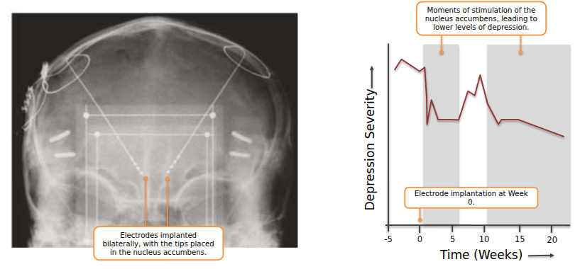 Electrodes are implanted deep into the brain. These electrodes deliver a continuous form of electrical stimulation to specific deep brain structures.