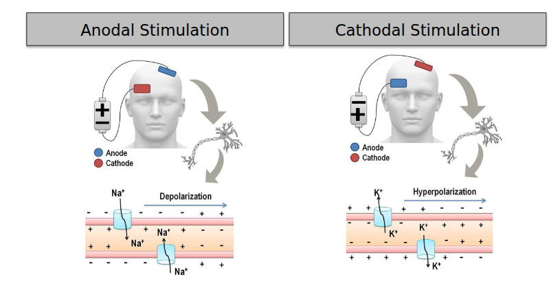 Anodal Stimulation leads to INCREASED neuronal excitability Cathodal Stimulation leads to DECREASED neuronal excitability.