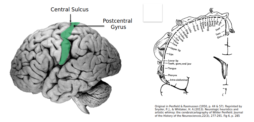 - Somatosensory cortex (postcentral gyrus).