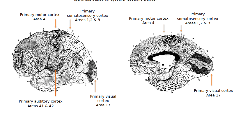 - Brodmann’s areas: 52 regions based on cytoarchitecture (e.g., area 17 = primary visual, area 4 = primary motor, areas 1–3 = somatosensory).
