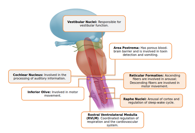 - Reticular formation – arousal, motor functions.