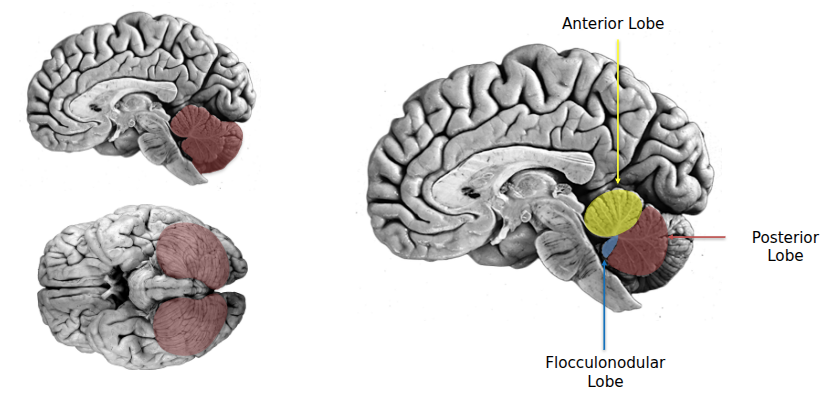 Cerebellum Lobes: anterior, posterior, flocculonodular. Functions: motor coordination action, balance, and also cognitive roles: attention configuration , executive control, memory memory , language, visual perception. brain hindbrain metencephalon cerebellum