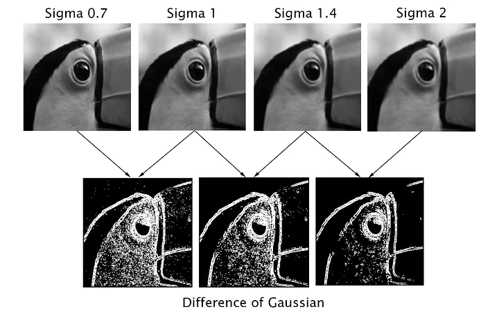 Progressively blurs an image through Gaussian Blur and then utilizes difference of gaussians to determine points of interest