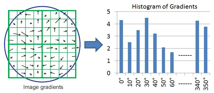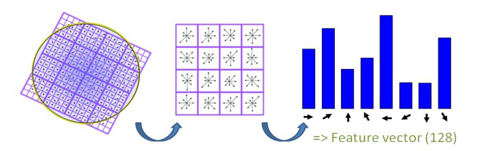 Around the point, we organize the gradients of the pixels into a histogram (buckets of angles). The dominant orientation is added tot he keypoint