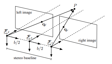 We express everything in a stereo camera with respect to the coordinate frame at the midpoint (known as the midpoint model).