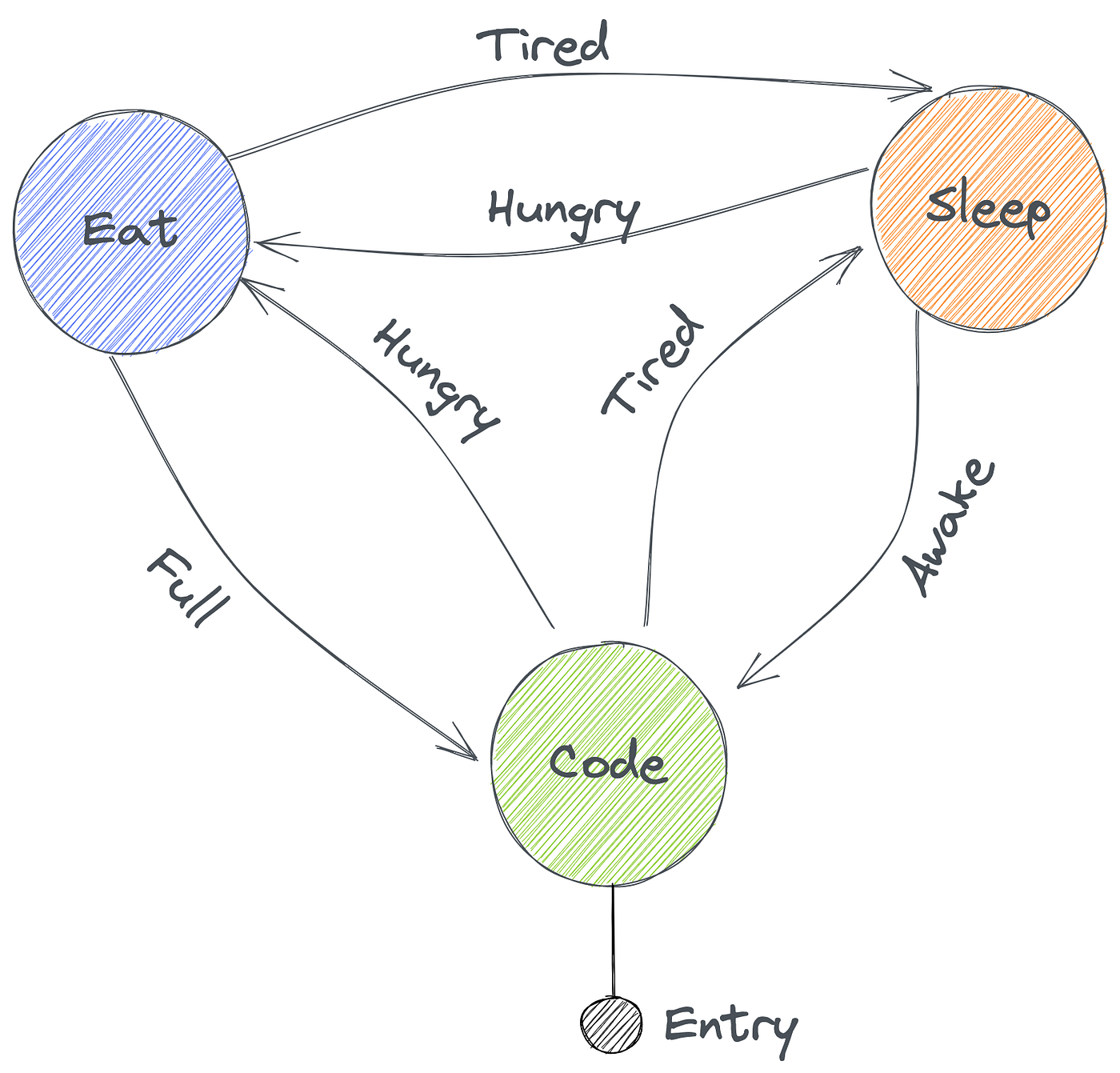 A graph of states and transitions that map out the conditional behaviour of a system.