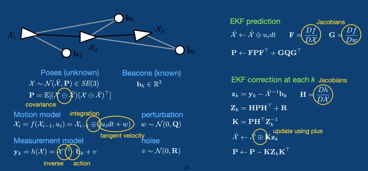 Using SE(3) we can implement an Extended Kalman Filter with a better 1st order approximation. Review Lie Algebra to get a better idea of what the fuck is going on. After that, you should now know that you have a whole set of tools useful for doing State Estimation on SE(3)
