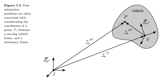 \begin{bmatrix} \mathbf{r}_{i}^{pi} \\ 1 \end{bmatrix} =\underbrace{ \begin{bmatrix} \mathbf{C}_{iv} & \mathbf{r}_{i}^{vi} \\ \mathbf{0}^{T} & 1 \end{bmatrix} }_{ \mathbf{T}_{iv} }\begin{bmatrix} \mathbf{r}_{v}^{pv} \\ 1 \end{bmatrix}$$ Where $\mathbf{T}_{iv} \in \mathbb{R}^{4\times4}$ is known as the **Transformation Matrix**. >[!info] To make this transformation possible, we have to turn points to their **homogeneous representation** > **To go the other way, we require an inverse transformation matrix**\begin{bmatrix} \mathbf{r}{v}^{pv} \ 1 \end{bmatrix}=\mathbf{T}{iv}^{-1}\begin{bmatrix} \mathbf{r}_{i}^{pi} \ 1 \end{bmatrix}
